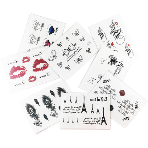8-Sheets Romantic Assortment Temporary Tattoos Stickers - Lip prints, Eiffel Tower, Bows, Feathers, Dandelions Tattoos