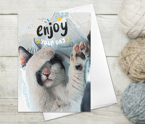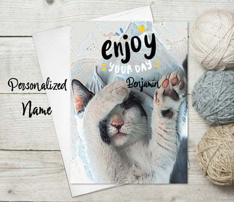 Personalize Cat Funny Greeting Cards Sleeping Cat Card Enjoy Your Day acrylic painting Card Thank You Cards Cat Custom Name Birthday Card